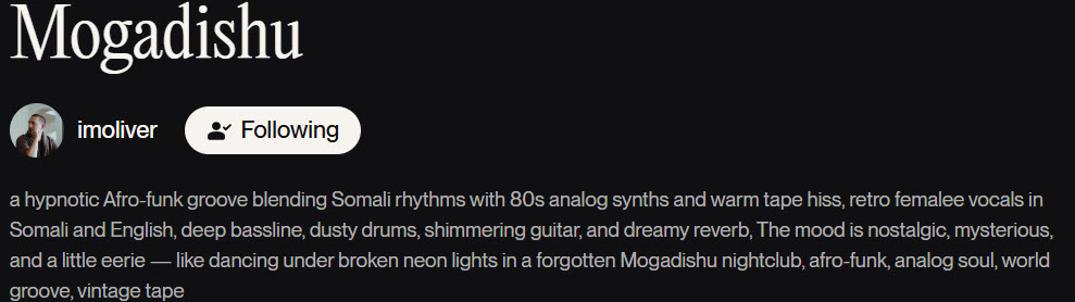Een muzikant mag je Imoliver misschien niet noemen, maar er is een mooie nieuwe term voor bedacht: Music Designer. Een titel die de lading dekt, want het is niet zoals velen denken, kwestie van een druk op de knop en je hebt een geweldige song. Het is nog een hele kunst om fraai resultaat te krijgen. Kijk maar eens naar de prompts die Oliver gebruikt, dat verzin je niet even snel.