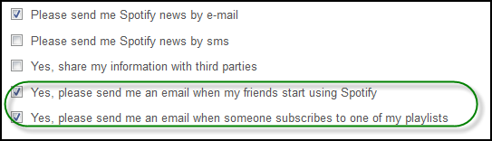 Je krijgt van Spotify een mailtje als je een nieuwe abonnee hebt op één van je playlists en als één van je Facebookvrienden een account opent bij Spotify. Je kunt dat overigens op de website van Spotify in je profiel uitschakelen.