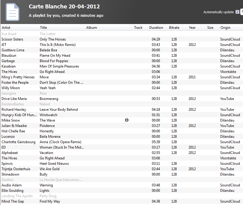 Laat ik de playlist van Carte Blanche als voorbeeld nemen. Deze wordt elke week gepubliceerd inclusief een link naar de Spotifyplaylist, maar helaas is de lijst op Spotify nooit compleet. Dat kan Tomahawk voor het grootste deel oplossen en ook voor de bezoekers die geen Spotify hebben levert Tomahawk een direct afspeelbare playlist.