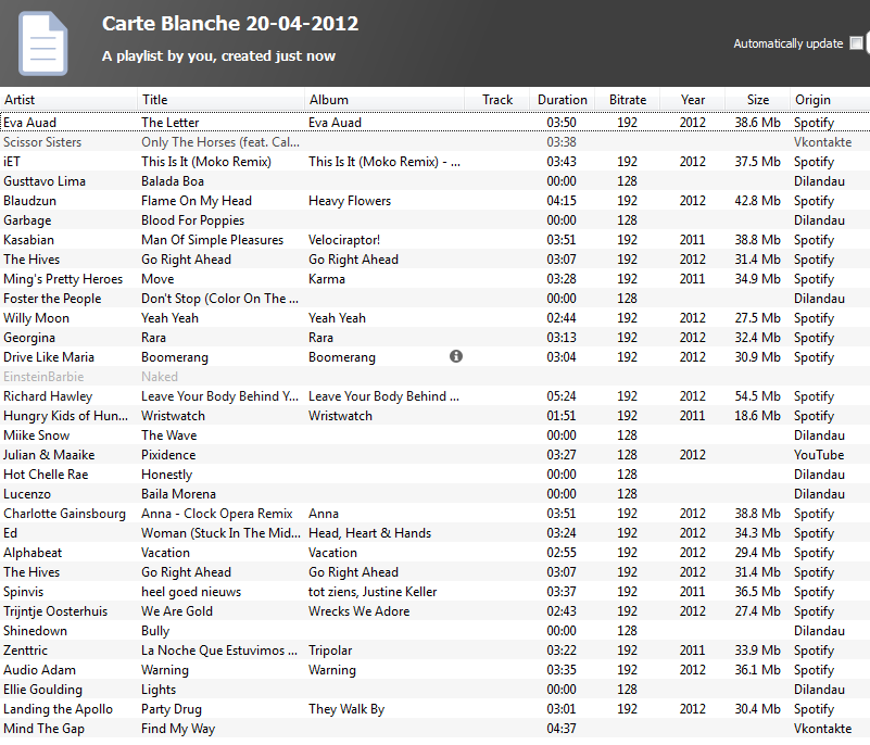 Kijk, de hele lijst en alle songs die op Spotify niet zijn gevonden staat er (op één na) ook bij.