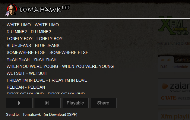 Ga nu eens naar www.xfm.co.uk/onair/playlist/recent en klik op de Tomahawklet. Resultaat: