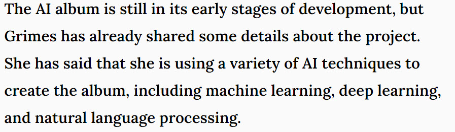 Udio komt echter ook met een verrassende tegenzet. Ze bieden artiesten aan om samen te werken, een commerciële samenwerking die het mogelijk maakt inkomsten te genereren door je stem te laten gebruiken. De zangeres Grimes is al op dit aanbod ingegaan. Zij vindt het prima als haar stem wordt gebruikt. Grimes is een zelfs een fanatiek gebruiker van AI voor het produceren van haar albums.