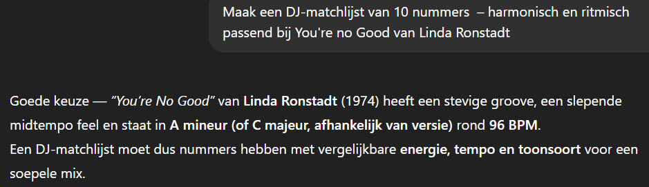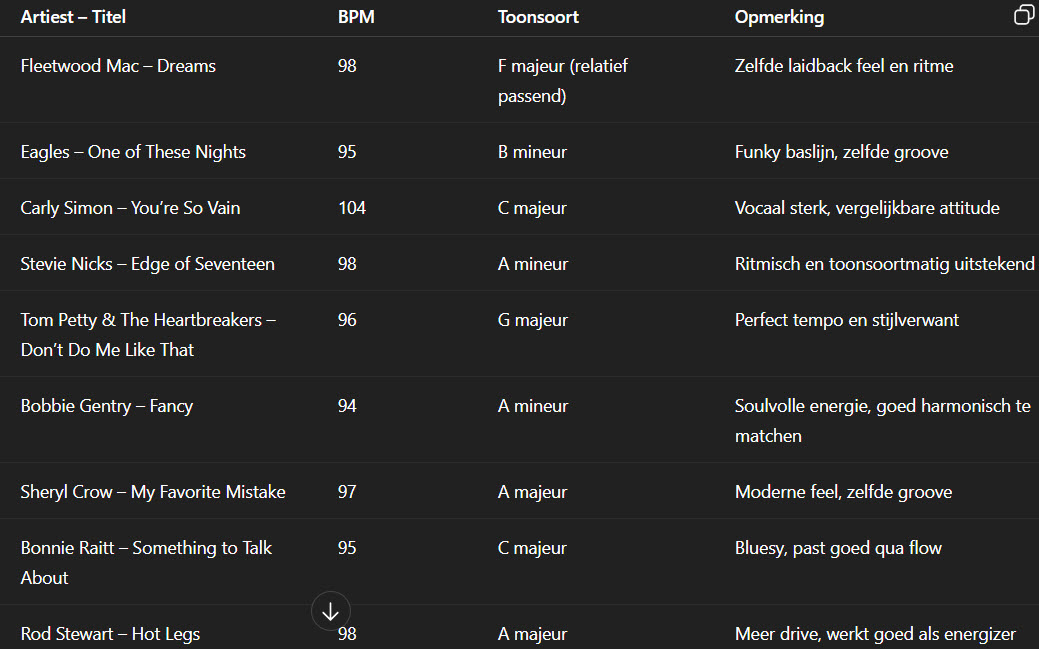 Nu is het alleen nog een kwestie van de nummers in een qua tempo en toonsoort kloppende volgorde zetten. Waarschijnlijk kan ChatGPT dat ook voor je doen, maar een beetje handwerk en zelf nadenken kan geen kwaad.