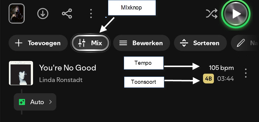 Als je veel geluk hebt vind je in een bestaande playlist al de nodige overeenkomsten, dan kun je eenvoudig de volgorde aanpassen via de knop “Bewerken” en zo goed mogelijk kloppend maken qua BPM en toonsoort.