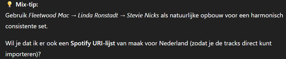 Het maken van de Spotify URI-lijst wilde helaas nog niet lukken bij ChatGPT. Er wordt gewerkt aan een koppeling tussen ChatGPT en Spotify, zodat je binnenkort via ChatGPT je playlists kunt samenstellen en direct openen in Spotify. Als dat live is kom ik er op terug. Voorlopig nog maar even handmatig de nummers opzoeken en toevoegen.
