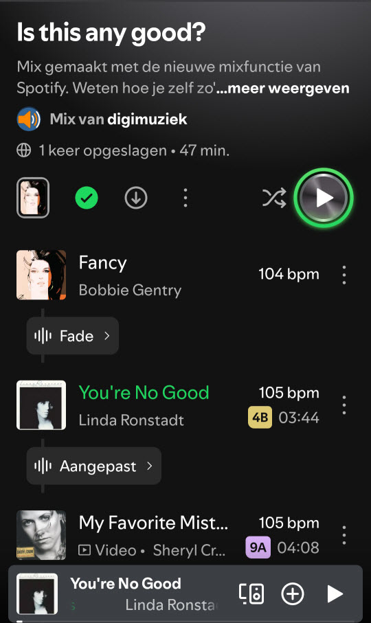 De mixfunctie is trouwens nog alleen op de mobiele apps van Spotify beschikbaar. Spotify geeft aan dat ook de desktopapp binnenkort wordt voorzien. De gemixte lijst kun je wel in de desktop app afspelen,maar op de webversie is er niets van de mix te vinden. Het is allemaal nog een bèta-versie dus Spotify zal nog met verbeteringen komen. Sorteren op BPM en toonsoort zou dan wel handig zijn.